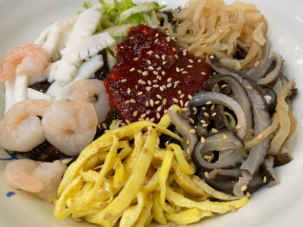 위에 올려진 고명(?)들을 보면.. 해파리, 해삼, 계란, 오징어, 새우, 오이 이렇게 보여지는데요...